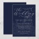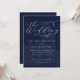 Impress your guests with this elegant wedding invitation by JessicaAmber. This classic card features a romantic calligraphy title for 'the wedding of'. Elegant dark blue lettering displays the bride and groom names, and details of the wedding, including the location, date and time. The background has a faint vintage illustration of a castle on a navy blue background, which you can replace with an image of the destination where you will be married (transparent background preferred). This invitation is preferred for when the couple are hosting the event themselves.