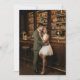 This wedding invitation features a romantic bar setting with warm, ambient lighting and wooden shelves filled with liquor bottles. The design showcases a couple in an intimate moment, with the man in a light green suit and the woman in a white dress, creating a cozy and affectionate atmosphere. The color palette includes rich browns and golden hues, enhancing the inviting mood of the scene. Perfect for couples who appreciate a touch of elegance and warmth, this invitation captures the essence of love and togetherness.