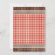 Une invitation romantique à la douche nuptiale avec thème barbecue, avec du bois rustique, un tableau noir, un tableau vintage d'une femme en robe rouge, des fleurs de coquelicots et de la dentelle sur un arrière - plan en vichy. Le dos est une combinaison de bois rustique avec dentelle sur un motif de rouge et d'ivoire en vichy.