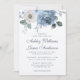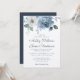 Faire-part de mariage en ivoire bleu foncé avec élégante calligraphie manuscrite et typographie classique, et une touche design de roses aquarellés dans une palette de couleurs bleu et ivoire luxuriante. Le dos de la carte est de couleur bleu foncé. Conçu exclusivement pour vous par Happy Dolphin Studio !