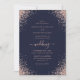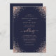 Elégant faire-part de mariage bleu marine et or rose avec parties scintillant or rose/confetti encadrant les détails mariages dans une police de caractères de script moderne.