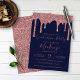 Rose Gold Sparkle Parties scintillant Drips Graduation Party Invitation avec des gouttes de fausse parties scintillant et l'arrière - plan bleu marine. Il existe un filtre optionnel pour aider à définir le texte blanc en bas ; il peut être désactivé en cliquant sur "customiser plus loin" et en supprimant ce calque. Conçu par Cèdre et String. Pour personnaliser davantage, cliquez sur le lien "customiser plus loin" et utilisez l'outil de conception pour modifier la conception. Si vous avez besoin d'aide ou d'articles correspondants, veuillez nous contacter à cedarandstring@gmail.com .