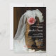 Invitez vos invités à célébrer les jeunes mariés le matin après leur cérémonie de mariage avec le faire-part de brunch occidental Country Rose et Cowboy Boots pour le lendemain de mariage, élégant et décontracté. Cette invitation personnalisée sur le thème du ranch, décontractée et rustique, pour le petit-déjeuner ou le déjeuner après le mariage, présente une photographie de style ferme charmante de bottes de cowboy en cuir brun remplies d'une fleur de rose rose et d'un voile de mariée blanc avec un fond en bois de grange brun patiné. Une source d'inspiration parfaite pour votre réception de mariage décontractée dans une grange.