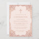 Cette élégante invitation de confirmation en or rose et rose à l'air vintage, recommandée pour une fille, a un cadre en or (faux) rose orné avec des branches méandantes avec feuilles d'or sur un arrière - plan rose roux. Au-dessus du texte il y a une croix religieuse en or rose. Tout le texte peut être personnalisé et a une couleur rose semblable au cadre doré rose. Le cadre vintage et orné de feuilles dorés est basé sur une reliure de livre antique, "Le XVIIIe siècle Ses institutions, coutumes et costumes" de Paul LaCroix, publiée en 1876, maintenant dans le domaine public.