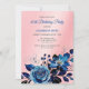Faites honneur à une femme spéciale avec cette élégante et féminine invitation à la fête d'anniversaire. Ce design présente une fleur rose bleu marine aquarelle avec des papillons et des parties scintillant dorées sur un arrière - plan rose. Tous les textes sont modifiables. Objets correspondants disponibles en magasin !