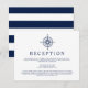 Cartes d'invitation de réception sur le thème nautique avec une rose des vents de style vintage et un fond rayé bleu marine et blanc au verso.