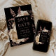 Ce mariage élégant et maussade Save the Date propose un bouquet floral luxuriant et romantique en ivoire avec fausse feuille d'or rose et feuillage de parties scintillant sur un arrière - plan noir. Customisez le texte rose rose dans des polices de style sur un rectangle noir, puis ajoutez l'URL de votre site Web mariage au dos noir solide.