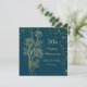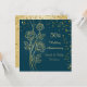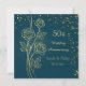 Carte d'anniversaire de mariage 50 ans avec des roses dorées stylisées et des confettis sur un fond vert bleu. Au dos de l'invitation se trouve un confetti doré sur fond doré