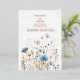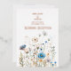 Une belle invitation blanche avec Rose Gold Texte et image des fleurs sauvages de terrain en bleu, jaune et crème. Le dos est un joli texte en or rose avec tous les détails mariages en noir avec la même image des fleurs sauvages.