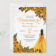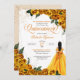 Quinceanera invitation en roses jaune or avec des accents or et une fille avec élégante robe à boule. Consultez la boutique pour cette invitation avec des filles dans différentes couleurs de cheveux et de teintes de peau.