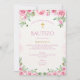 Cette invitation a été décorée de fleurs roses et d'une croix dorée.