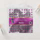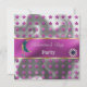 Une invitation élégante rose fuchsia et argent métallisé représentant une Lune bleue avec un charme de perle et saphir doré, des colliers de cœurs bleus sarcelle dorés et des étoiles roses fuchsia brillantes.