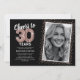 Élégante invitation de fête d'anniversaire trentième sur un fond noir stylé qui peut être changé en n'importe quelle couleur, une photo de la fille / du garçon qui fête son anniversaire, rose gold pailleté scintillant, trente ballons en helium rose gold et un modèle de texte moderne pour la célébration du 30e anniversaire facile à personnaliser.