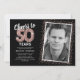 Élégante invitation d'anniversaire cinquantième avec un fond noir stylé qui peut être changé en n'importe quelle couleur, une photo de la fille / du garçon qui fête son anniversaire, paillettes rose gold, cinquante ballons en hélium rose gold et un modèle de texte moderne pour la célébration des 50 ans facile à personnaliser.