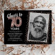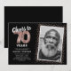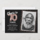 Élégante invitation d'anniversaire soixante-dix ans avec un fond noir stylé qui peut être changé en n'importe quelle couleur, une photo de la fille / du garçon qui fête son anniversaire, paillettes rose gold, soixante-dix ballons en helium rose gold et un modèle de texte moderne pour célébrer les 70 ans facile à personnaliser.