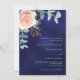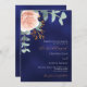 Un fond de couleur bleu marine. La couleur bleue est inégale. Décoré avec une florale rose gold et rose blush, fleur de rose et feuilles d'eucalyptus aquarellées vertes, brindilles, verdure et une brindille dorée factice. Personnalisez et ajoutez vos noms et détails. Texte de couleur blanche et dorée.