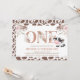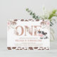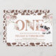 Rose Gold One Floral Cow 1st Birthday Invitation Les filles vache à thème de premier anniversaire avec un faux mot rose en feuille d'or orné de fleurs, deux arrangements floraux plus gros boho rose et un motif imprimé de vache brune. L'invitation de premier anniversaire à thème vaches de cette fille est idéale pour une fête de premier anniversaire à thème vaches.