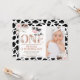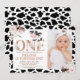 Rose Gold One Photo Floral Cow 1st Birthday Invitation Les filles vache thème de premier anniversaire invitation avec un faux mot rose en feuille d'or orné de fleurs, deux arrangements floraux plus gros boho rose et une planche de motif d'impression de vache noire. L'invitation de premier anniversaire à thème vaches de cette fille est idéale pour une fête de premier anniversaire à thème vaches.