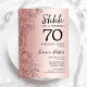 Rose Gold Surprise 70th Birthday Party Invitation. Design féminin de glam avec accents botaniques et police de script de typographie. Carte invitation florale simple parfaite pour une célébration anniversaire surprise femme élégante. Peut être customisé à n'importe quel âge. Invitations Zazzle imprimées ou téléchargement instantané modèle imprimable numérique.