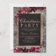 Une typographie dorée rose moderne, chic et élégante Invitation à la fête de Noël vert floral avec feuillage de feuilles d'aquarelle rouge bordeaux peint à la main sur un bois brun rayé rustique avec neige blanche et flocons de neige.