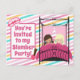 Jolies invitations rose pour une soirée pyjama d'anniversaire pour filles. Caractéristiques de belles bandes pastel sur le mur d'une chambre d'enfant derrière un beau lit rose et deux enfants. Personnalisez ces jolies cartes postales pour la soirée pyjama de votre enfant.