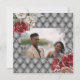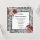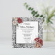 Un fond métallisé argent vieilli et rougi a un aspect argent métallisé avec des roses de couleur rouge et pêche mandarine atténuées dans les coins supérieur gauche et inférieur droit. Des pièces en filigrane floral argenté ornent chaque coin et une incrustation blanche avec un bord noir repose sur le dessus du design. Des modèles noirs modifiables avec des polices grasses et de calligraphie apparaissent sur l'incrustation pour votre texte personnalisé. Le dos a un fond en tissu faux argent et gris capitonné sur lequel apparaissent les mêmes roses de couleur. Ce design chic et élégant est idéal pour un mariage d'été, de printemps, d'automne ou d'hiver, un anniversaire ou un renouvellement de vœux.