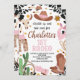 Pink Rustic Saddle Up First Rodeo 1st Birthday Invitation Bold principalement rose et marron fille's 1st rodeo anniversaire invitation avec un casquette cowgirl brun et rose, crâne taureau, cactus, corde, gant cowgirl, bottes et plus. C'est ma première invitation d'anniversaire de rodéo pour une petite fille est idéale pour une fête d'anniversaire occidentale ou sauvage.