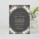 Notre invitation vintage à la douche nuptiale à fleurs boho mariage est composée d'un agencement floral moody de roses romantiques, de fleurs de pivoines et d'anémones, de verdure et de plume bohème rustique dans des tons riches de rose poussiéreux, rose mauve, cassis, blanc crémeux, vert mousse, gris et or sur une couleur gris foncé / noir arrière - plan. Une palette de couleurs dramatique et rêveuse pour votre mariage d'automne ou d'hiver. Personnalisez le beau texte personnalisé pour votre événement rustique élégant.