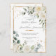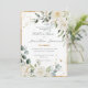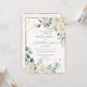 Roses blanches élégantes et marguerites minuscules entourées d'un cadre doré rustique et d'une végétation mixte d'eucalyptus avec d'autres faire-part de mariage feuille aquarelle. L'arrière - plan blanche propre ajoute à l'élégance de ce design charmant. Juste exquis. Faux or éclaboussé sur le devant et le dos pour créer un look chic.