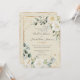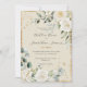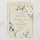 Roses blanches élégantes et marguerites minuscules entourées d'un cadre doré rustique et d'une végétation mixte d'eucalyptus avec d'autres faire-part de mariage feuille aquarelle. Fleurs de couleur neutres sur un arrière - plan crème. Juste exquis. Faux or éclaboussé sur le devant et le dos pour créer un look chic.