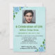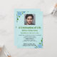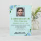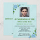 Cette carte modifiable présente une photo en haut. Elle est modifiable afin que vous puissiez la remplacer par la photographie de votre proche. En dessous, se trouvent les détails de la célébration sur un fond bleu clair avec des roses bleues dans deux coins. Tout le texte sur le devant de la carte est modifiable, vous pouvez donc modifier les détails ainsi que le style, l'emplacement, la couleur et la taille de la police pour la personnaliser. Au dos se trouve un champ modifiable pour des informations complémentaires. Cette invitation modifiable peut être utilisée pour une célébration de vie, des anniversaires, des fiançailles, des anniversaires de mariage, des départs à la retraite, etc.