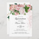 Quinceanera invitation avec roses vintages et feuillage élégant sur arrière - plan blanc. Toutes vos informations sont dans une combinaison de polices de caractères élégantes et de scripts. Vous pouvez customiser tout le script et modifier la couleur selon vos propres préférences. A l'arrière se trouve un grand bouquet de roses. Invitation Extraordinaire pour cette étape importante dans votre vie de filles