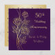 Carte d'anniversaire de mariage de 50 ans avec des roses dorées stylisées sur fond violet. Au dos de l'invitation se trouve un cadre élégant de volutes violettes sur fond doré.