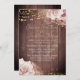 Cette invitation de mariage a un thème shabby-chic. Le fond est un motif de planches de bois ou de promenade en bois avec des roses rose blush en aquarelle avec des accents de paillettes. Des guirlandes lumineuses romantiques accentuent les fleurs en haut.