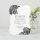 Ce faire-part de mariage présente des illustrations audacieuses de roses dans un style de gravure d'époque en noir et blanc dressé contre un arrière - plan blanc clair. Vos détails apparaissent en caractères gras et en noir. L'envers a un bouquet de coordination de roses noires et blanches qui est prêt à être customisé avec les initiales monogrammes de la mariée et du marié.
