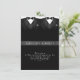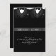 Joli tuxedos noir, formel, avec des cravates d'arc. Ruban satiné gris pour votre texte. Parfait faire-part de mariage gay. Reverse a deux belles roses rouges profondes sur l'arrière - plan noir.
