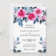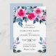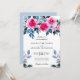 Elégant design d'invitation de mariage avec roses d'aquarelle rose vif, feuillage bleu et gris sur un arrière - plan blanc. Le côté inverse de l'invitation est en bleu poussiéreux.