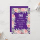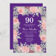 Cette élégante invitation à l'anniversaire de la flore présente une fleur rose rose avec des feuilles et des arrangements de verdure sur fond de violet.