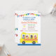 Les roues sur l'autobus vont en rond ! Cet autobus scolaire jaune a les enfants heureux et souriants sur leur chemin à la fête d'anniversaire d'amusement en ville ! Perfectionnez pour les enfants qui aiment des autobus de véhicules de transport particulièrement ! Les drapeaux d'étamine d'arc-en-ciel décore l'arrière - plan. Personnalisez facilement avec vos détails de partie.
