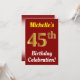 Ce design d’invitation à la fête d’anniversaire comporte un message comme "La fête du 45e anniversaire de Michelle!", où le nom peut être personnalisé, et où le numéro "45e" a un faux aspect doré. Il est également décoré d'un arrière - plan de couleur rouge. Les détails de l'événement sur le dos peuvent être customisés. Il pourrait être utilisé pour invitation des gens à la fête du quarante-cinquième anniversaire de quelqu’un ou à la fête d’anniversaire de quelqu’un. [~Z0000120]