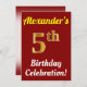 Ce design d’invitation à la fête d’anniversaire comporte un message comme "La fête du 5e anniversaire d’Alexandre!", où le nom peut être customisé, et où le numéro "5e" a une apparence de faux or. Il est également décoré d'un arrière - plan de couleur rouge. Les détails de l'événement sur le dos peuvent être customisés. Il pourrait être utilisé pour invitation des gens à la fête du cinquième anniversaire ou à la fête d’anniversaire de quelqu’un. [~Z0000120]