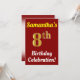 Ce design d’invitation à la fête d’anniversaire comporte un message comme "La fête du 8e anniversaire de Samantha !", où le nom peut être personnalisé, et où le numéro "8e" a une apparence fausse or. Il est également décoré d'un arrière - plan de couleur rouge. Les détails de l'événement sur le dos peuvent être personnalisés. Il pourrait être utilisé pour invitation des gens à la fête du huitième anniversaire ou à la fête d’anniversaire de quelqu’un. [~Z0000120]