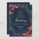 De riches et profondes fleurs rouges encadrent un fond sombre et bleu marine, créant une atmosphère dramatique et élégante. Ce design évoque un sentiment de romance raffinée et de charme sophistiqué. C'est parfait pour une union classique et intemporelle.