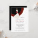 Un graphisme simple mais élégant d'une mariée portant une robe de mariage de queue de sirène blanche. Elle a les cheveux en haut et tient un bouquet de roses rouges bordeaux foncé avec feuillage feuille d'or et est encadrée par un demi-cercle noir, marron et faux or. Ce design est sobre mais classe et est idéal pour une douche nuptiale ou tout événement nuptial.