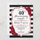 Invitation de fête d'anniversaire de mariage de 40 ans rouge rubis. Élégante carte d'invitation rouge, noir et blanc avec faux argent scintillant. Présente des rayures noires et blanches stylées, une police script et des roses rouges. Parfait pour une célébration de 40e anniversaire.