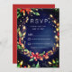 Cette invitation RSVP mariage hiver-Noël élégante et festive est parfaite pour la saison des fêtes. Il représente des fleurs d'aquarelle rouge, bleu marine et vert sur un arrière - plan d'aquarelle bleu marine. Ce design de fleurs hivernales est parfait pour des soirées tendance et élégantes. Concevez avec votre message et vos informations. Tous les dessins sont imprimés.