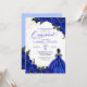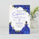 Quinceanera invitation en rose bleu royal avec des accents or et une fille avec une élégante robe de bal princesse. Consultez la boutique pour cette invitation avec des filles dans différentes couleurs de cheveux et de teintes de peau.
