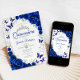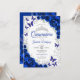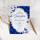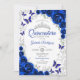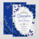 Royal blue silver and white Quinceanera celebration invitation. Features, script font, silver butterflies, watercolor roses and tiara. Perfect for an elegant princess style glam celebration. Personalize with your own details. Printed Zazzle invitations or instant download digital printable template.