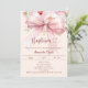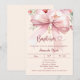 Un fond doux couleur crème et pêche, orné d'un grand ruban rose, d'une croix dorée et de fleurs roses. Personnalisez et ajoutez un nom et des détails.