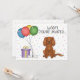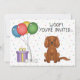 Design à thème d'anniversaire mignon avec le dessin original de Destei illustrant une jolie couleur rubis Cavalier King Charles Spaniel race dog. A côté du chien il y a des ballons colorés d'anniversaire attachés sur un os de chien et une boîte cadeau de couleur violet et jaune. L'arrière - plan a un motif ludique de confettis pastel colorés sur un arrière - plan blanc. Personnalisez les zones de texte exemples avec les détails de votre événement.